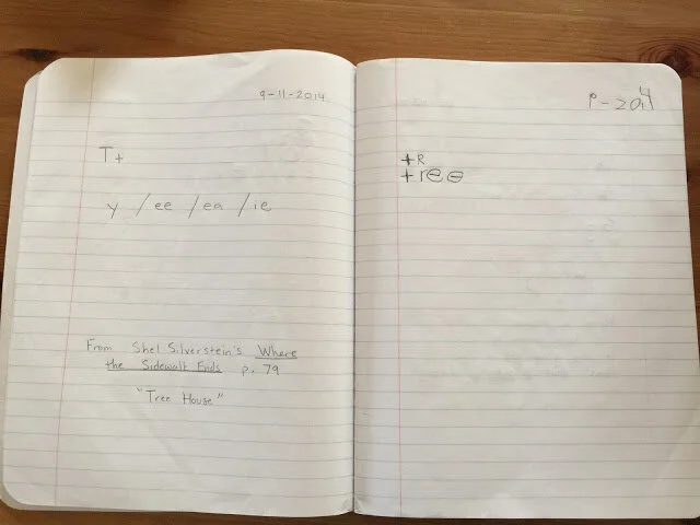 Upper and lower cases talked about, the different letters and combinations that make an “ee” sound. We could think of two or three words aloud for each example. This dictation was in the context of a poem read together, so the title and author are brought into the conversation. And they had the opportunity to read a great poem together, and chat about it!